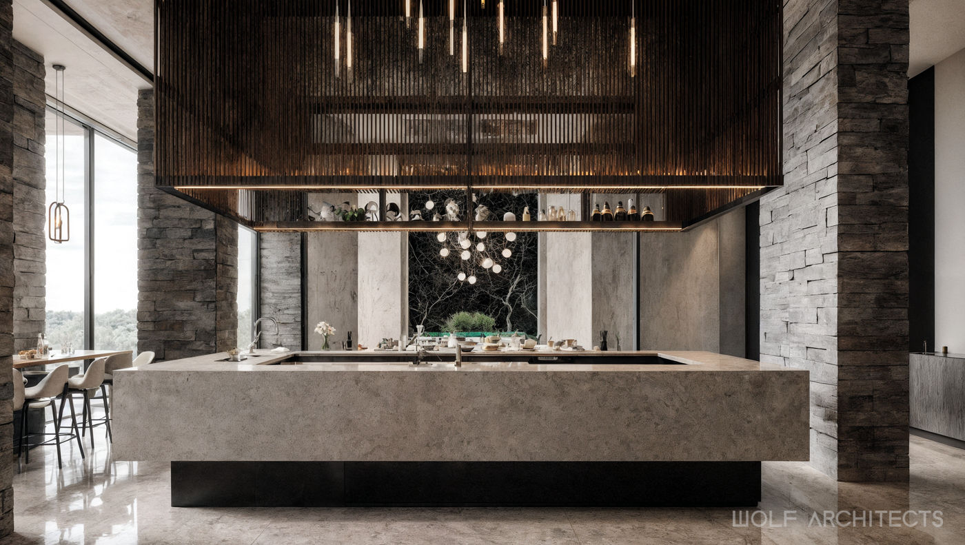 The main materials used for the exterior and structure are concrete and brick. Internally there are expanses of smooth white render to contrast against the dark brickwork. Solid American Oak is used extensively for the flooring and as well as the door and window frames. Travertine stone is used to trim various areas as skirting and almost all of the tiles used throughout the bathrooms and swimming pool were custom made. Whilst there were no limits to what the architect could select with respects to materials and finishes, it was important to ensure a sense of class and prestige. The client challenged WOLF Architects to provide the feeling and look of absolute luxury without going down the path of creating a mock French provincial style building. WOLF Architects aimed to prove that a modern contemporary building could also be luxurious, elegant and classy. In a time when people everywhere were building mock ups of classical buildings in an attempt to portray class and elegance, the Parrish house was about doing all of that and more with the contemporary flare that WOLF Architects are so well renowned for. This is not always achieved by using the most expensive of everything, it is a matter of understanding the way the eyes and hands experience space. WOLF Architects did extensive research and testing of this theory of which was implemented in the bathroom and kitchen areas to ensure that the interior design exuded elegance and opulence throughout.
